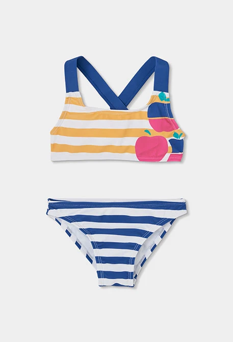 Bikini para niña que destaca por su diseño de rayas azules y amarillas, combinando colores vibrantes que le aportan un toque veraniego y divertido. El material es resistente al agua y asegura comodidad y libertad de movimiento. Presenta detalles de frutas que añaden un elemento lúdico al conjunto. Con tirantes azules que cruzan en la espalda, es ideal para disfrutar de la piscina o la playa, ofreciendo un estilo moderno y funcional.