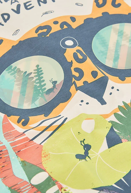 Camiseta de algodón crudo para niño, ideal para el verano, presenta un diseño alegre con un gran dibujo frontal de un leopardo con gafas y una frase inspiradora. Su tejido de algodón proporciona comodidad y transpirabilidad, perfecto para el uso diario. Su color neutro permite combinarla fácilmente con pantalones cortos o jeans, haciendo de esta camiseta una opción versátil y divertida para las aventuras diarias.