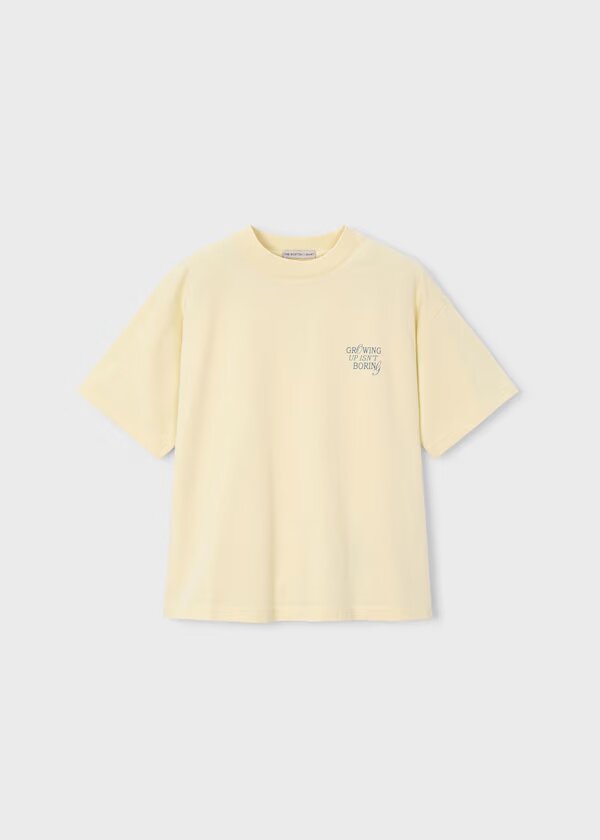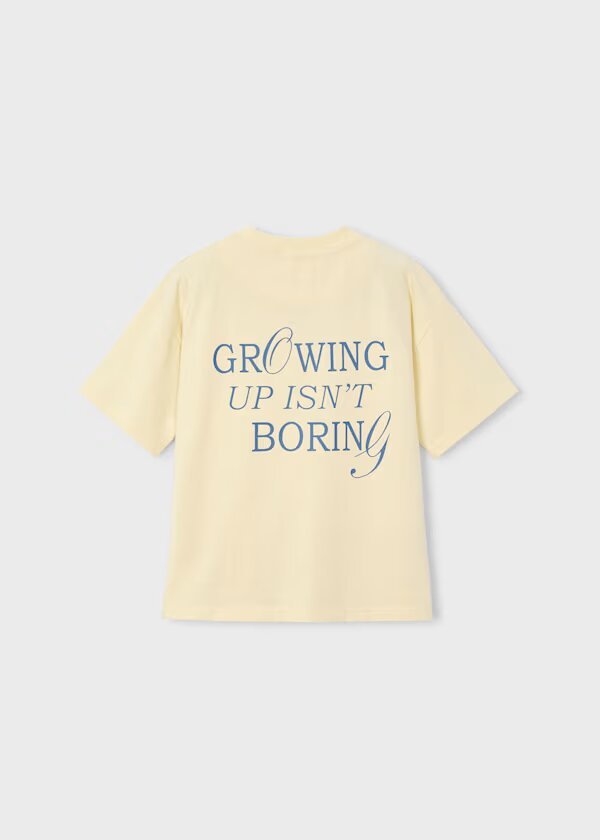 camiseta manga corta color amarillo pastes con serigrafía letras en la espalda.
