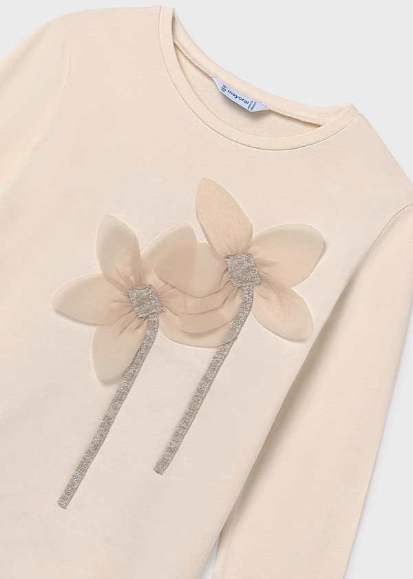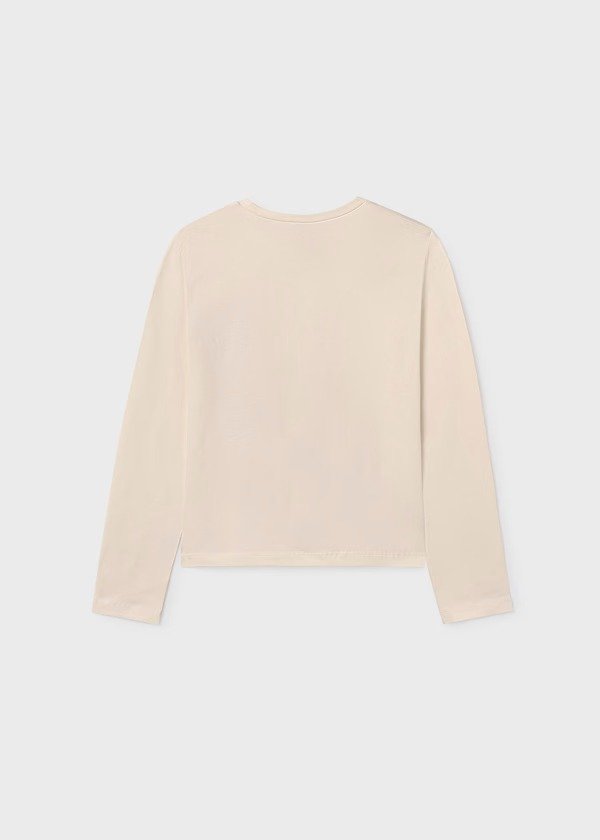 Camiseta de manga larga para chica color rosa con detalle de flores bordadas . Cuello redondo.