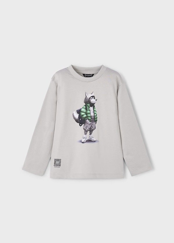 Camiseta de manga larga para niño. Cuello redondo. Elementos de adorno: serigrafía (zorro). Prenda con código QR perteneciente a colección interactiva PLAY WITH. Al escanear el QR accederás a un videojuego exclusivo de Mayoral.