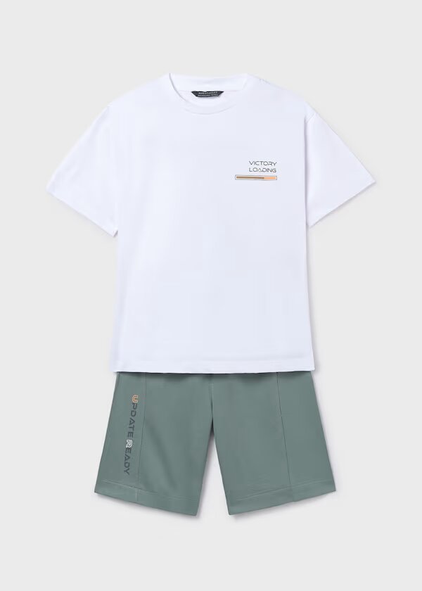 conjunto punto , camiseta manga corta blanca con serigrafía de unos cascos , pantalón color laurel.