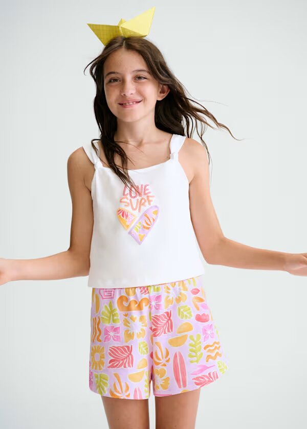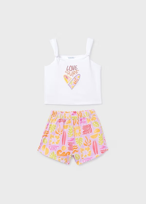 conjunto pantalón corto estampado y camiseta tirantes blanca tablas surf para chica.
