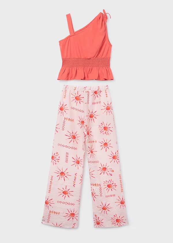 conjunto pantalón largo estampado y top liso de algodón en color coral para chica.