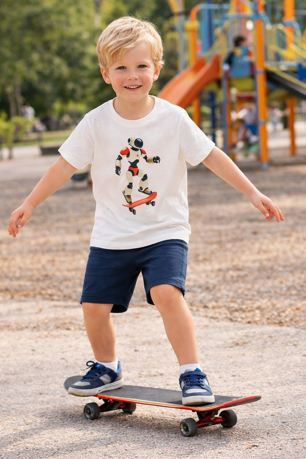 conjunto de punto para niño, lleva una camiseta manga corta roja y otra blanca con un robot.