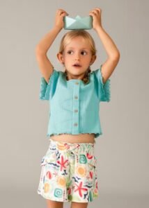 pantalón corto estampado multicolor para niña, tejido viscosa y algodón. Muy cómodo ligero y fresquito para los días más calurosos de verano.