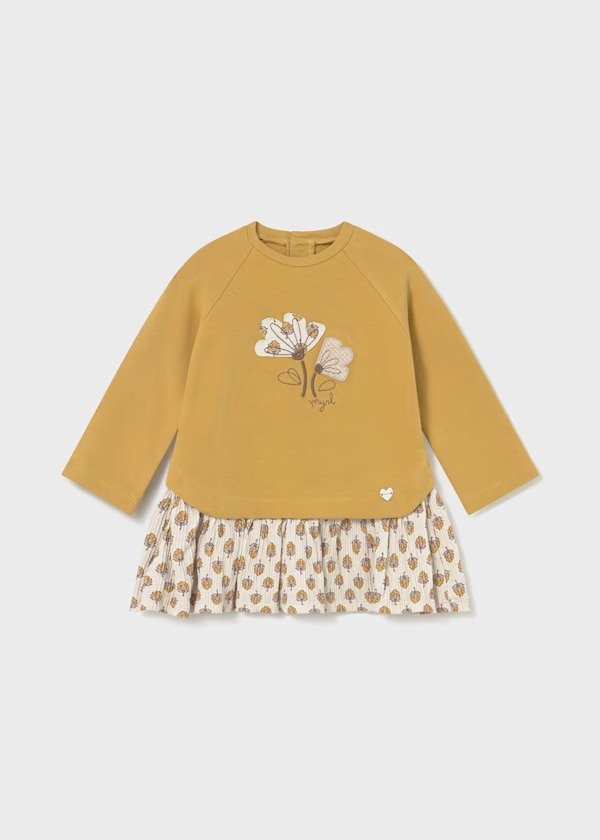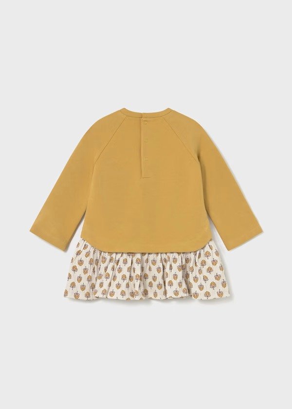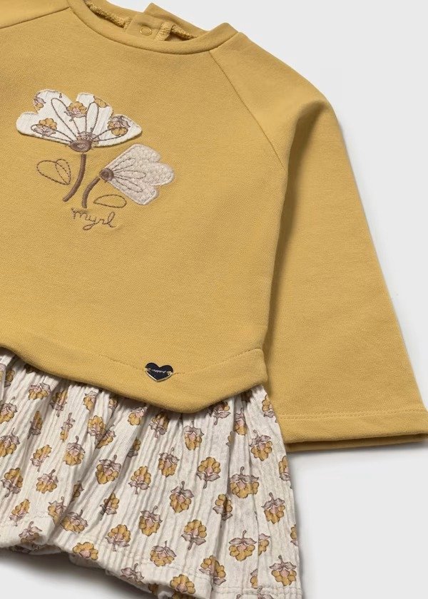 Vestido de manga ranglán para bebé. Cuello redondo. Diseño simulado con jersey en superposición. Cierre con botones a presión en la parte posterior. Cálido tejido de felpa gruesa (felpa perchada), perfecta para los meses fríos. Elementos de adorno: bordados, aplique posicionado. Diseño estampado.