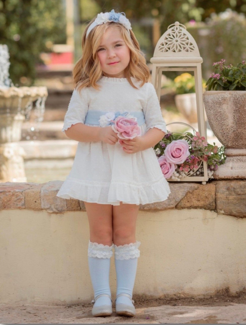 Vestido blanco ,tejido en plumeti , lleva un cinturón de gasa en color feles con detalle de flores , se pueden quitar , llevan un clip . Tiene una espalda en pico con un lazo ya hecho .